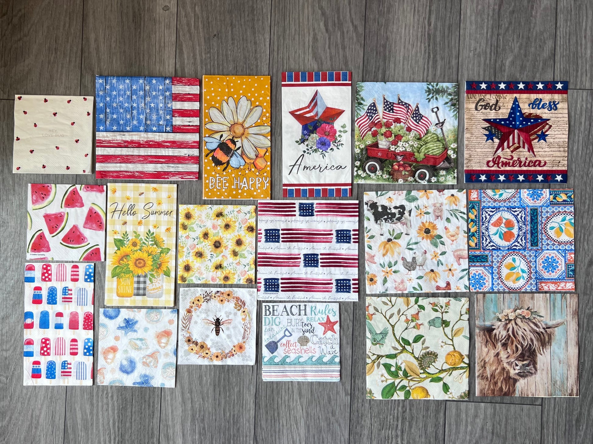 You get 18 individual decoupage napkins for crafting. Many of the napkins have 2-6 designs so that you can get many crafts out of one napkin. Most of the napkins are seasonal with "everyday" designs sprinkled in.