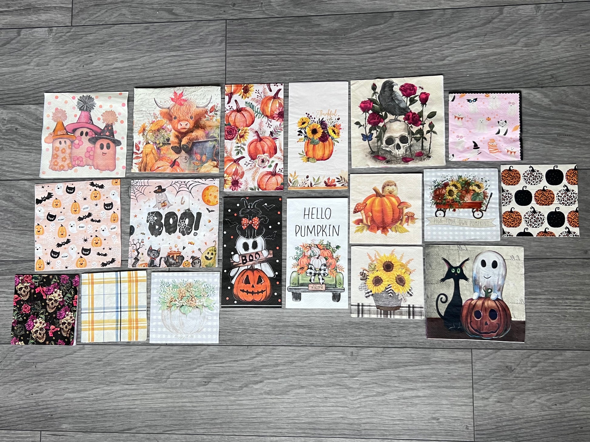 You get 18 individual decoupage napkins for crafting. Many of the napkins have 2-6 designs so that you can get many crafts out of one napkin. Most of the napkins are seasonal with "everyday" designs sprinkled in.