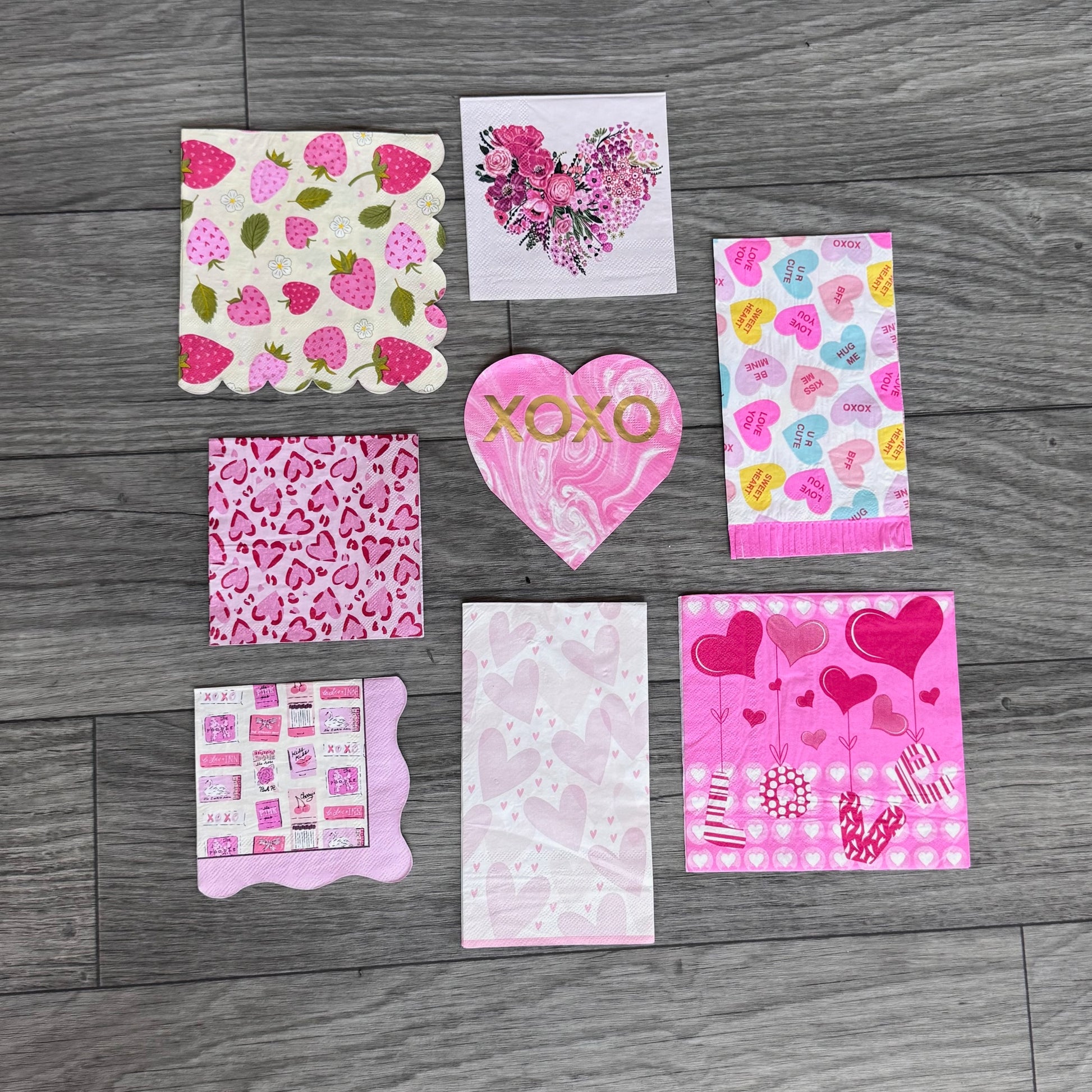 Pack of 8 Valentines Day Pink and Red napkins. This pack will give you all the LOVE vibes with all the hearts, in a pink and conversation heart theme. You get 1 of each design, and each design has multiple images. Free shipping!