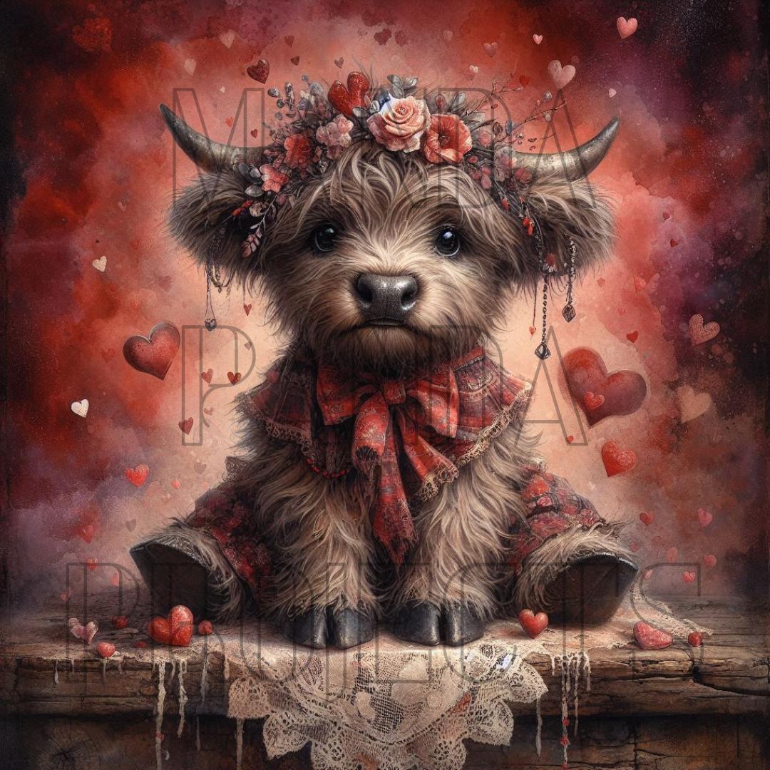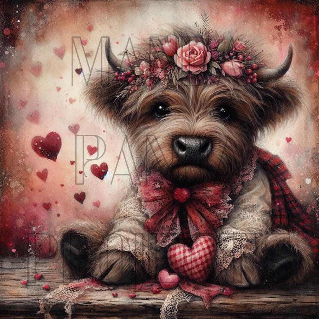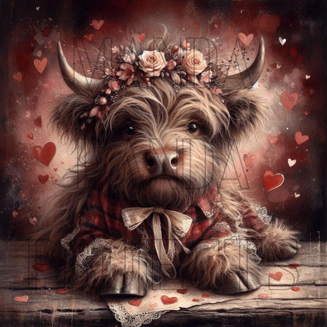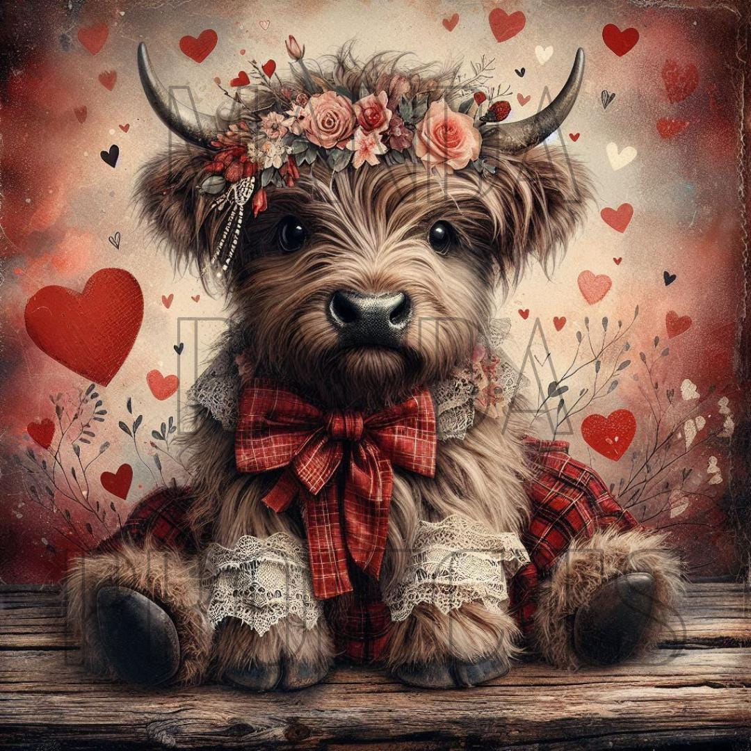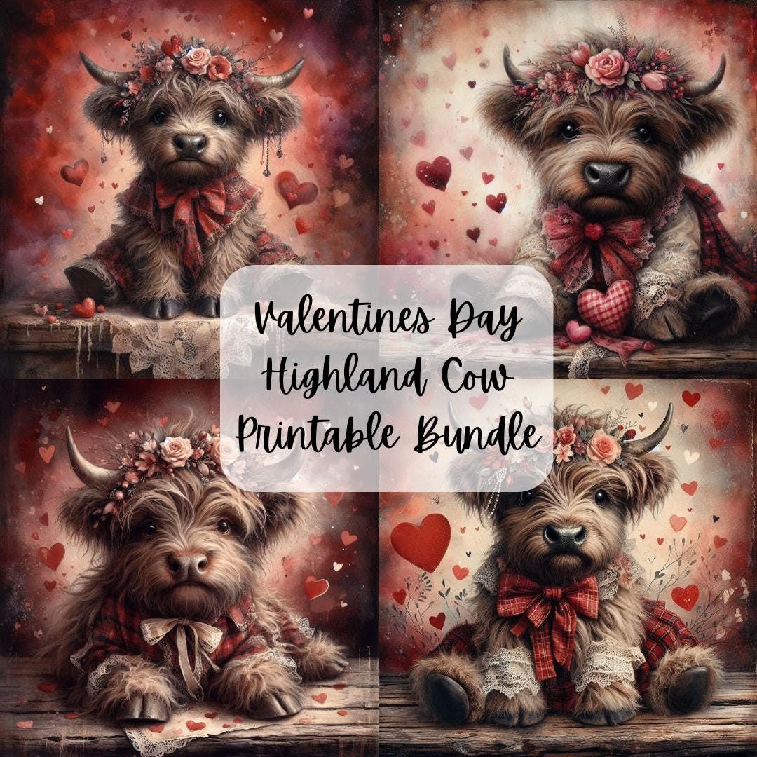 Celebrate the season of love with the sweetest Highland cows around! This Valentine’s Day Highland Cow Printable Bundle features 4 adorable baby cows dressed in bows, lace, and flower crowns, surrounded by hearts and romantic textures—perfect for cozy cottagecore vibes or rustic Valentine’s decor.