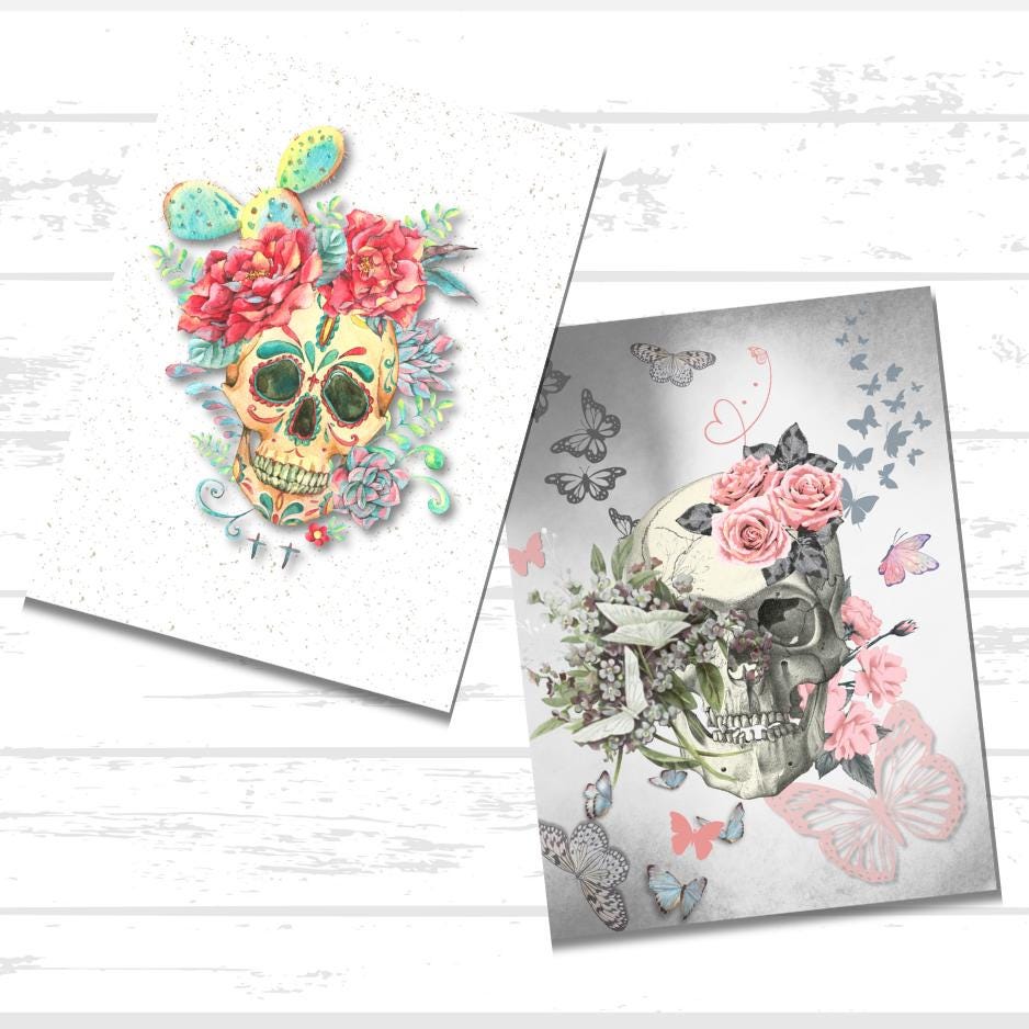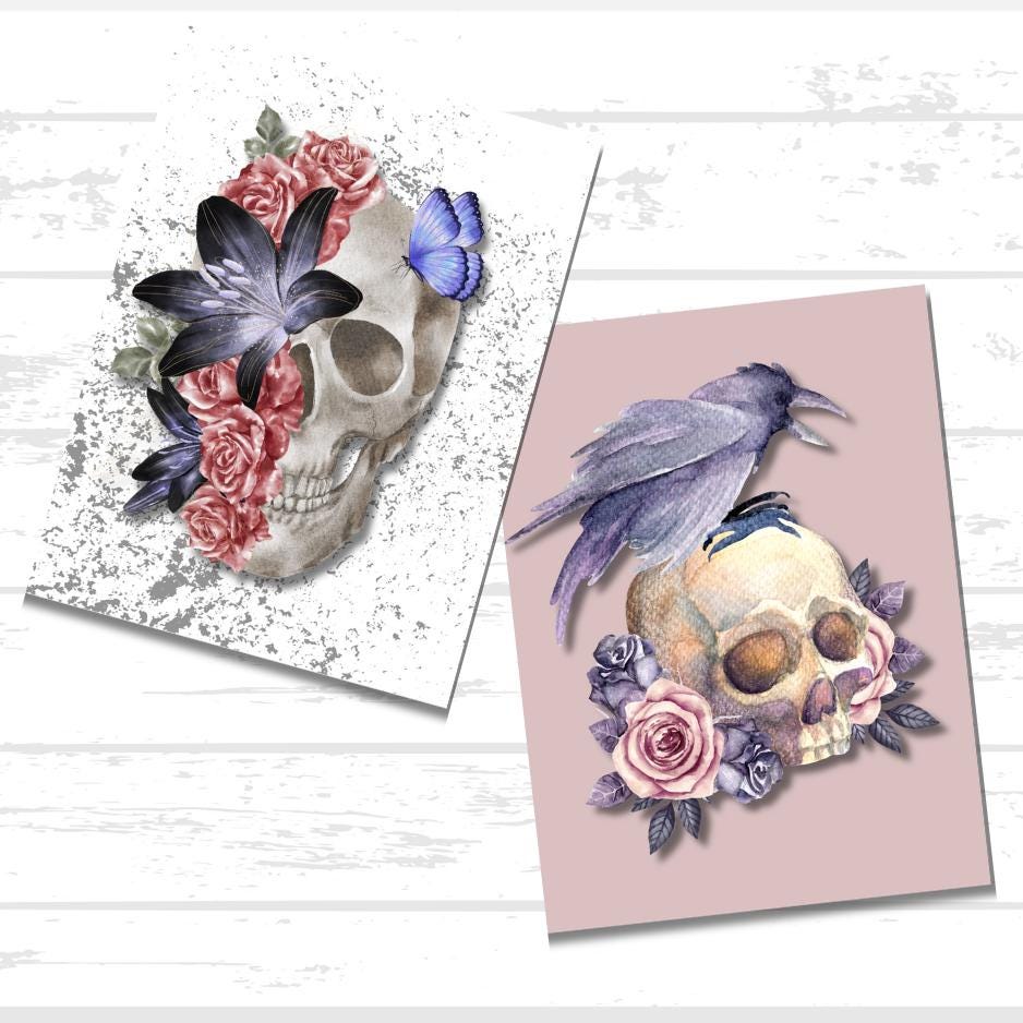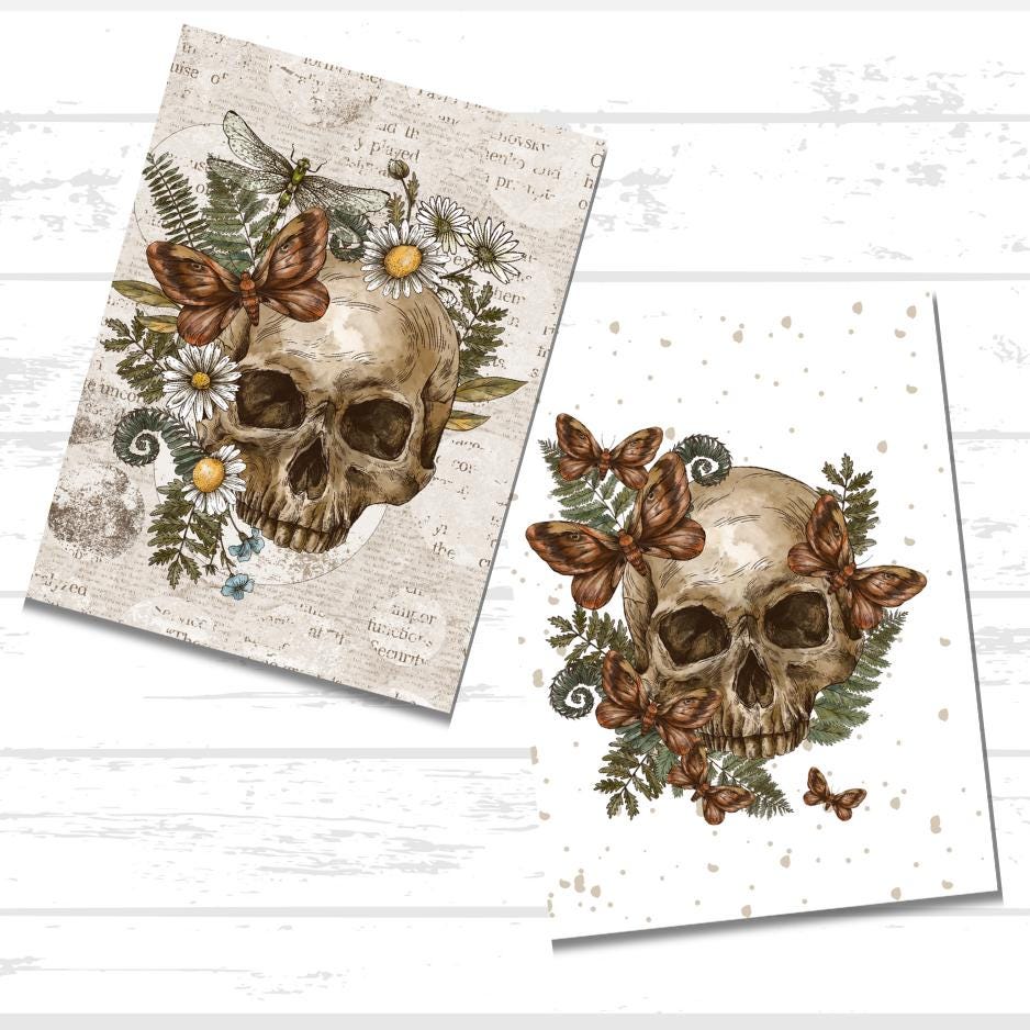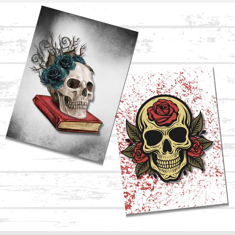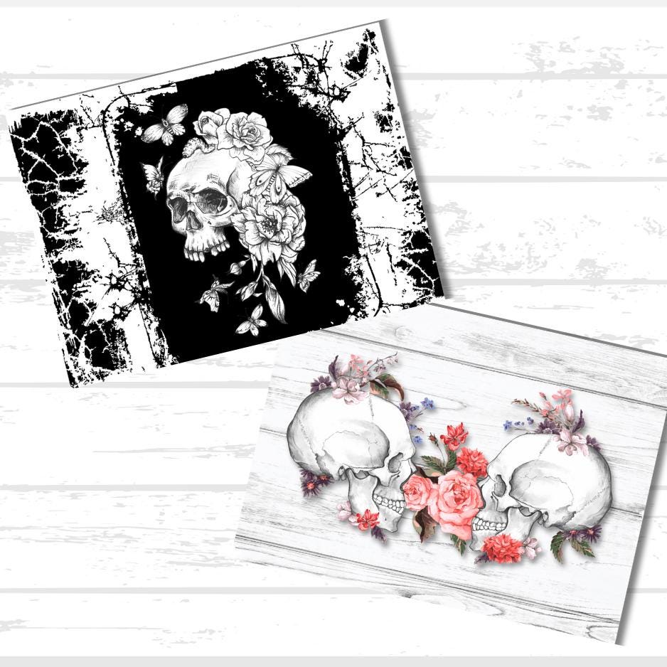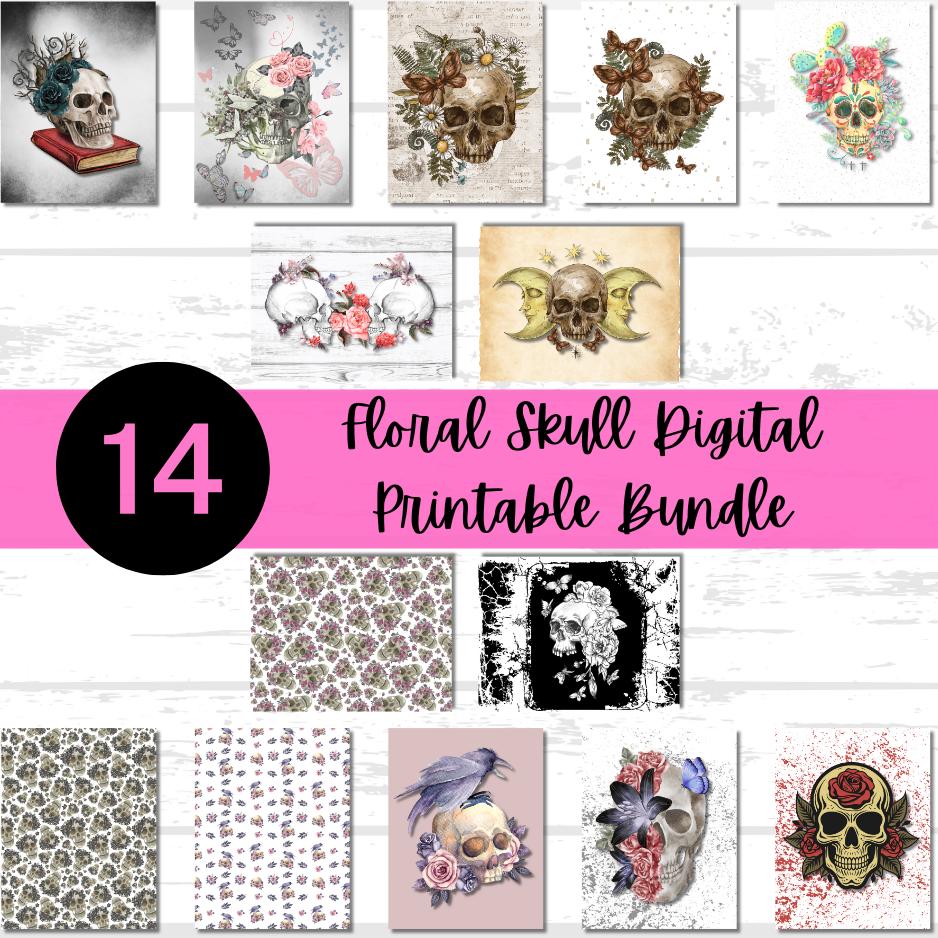 Printable bundle of 14 different Floral Skull Themed Digital Scrapbook and Printable Paper pages for crafting and decorating. You get all 14 prints that you see in the listing photos. There are several different Floral and Skull designs, all around the same central theme of Skulls. There is a mixture of Printable art and scrapbook paper styles, so some of them you can print and hang is is and others you can use for crafting. Perfect for Halloween, Emo, Gothic, and year round vibes for anyone who loves and decorates with skulls.