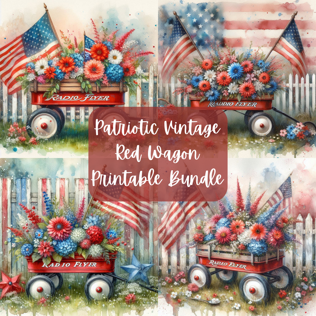 Printable bundle of 4 different styles of digital prints for crafting and decorating. You get all 4 prints that you see in the listing photos. There are several different vintage red Radio Flyer wagons with red, white and blue flowers, American Flags, and patriotic picket fence. This paper is perfect for Memorial Day, 4th of July, Summer, and Everyday crafts and decor. These can also be used as printable art for framing.