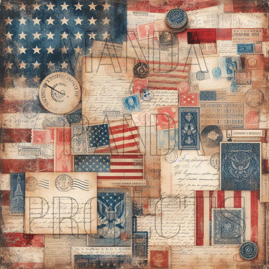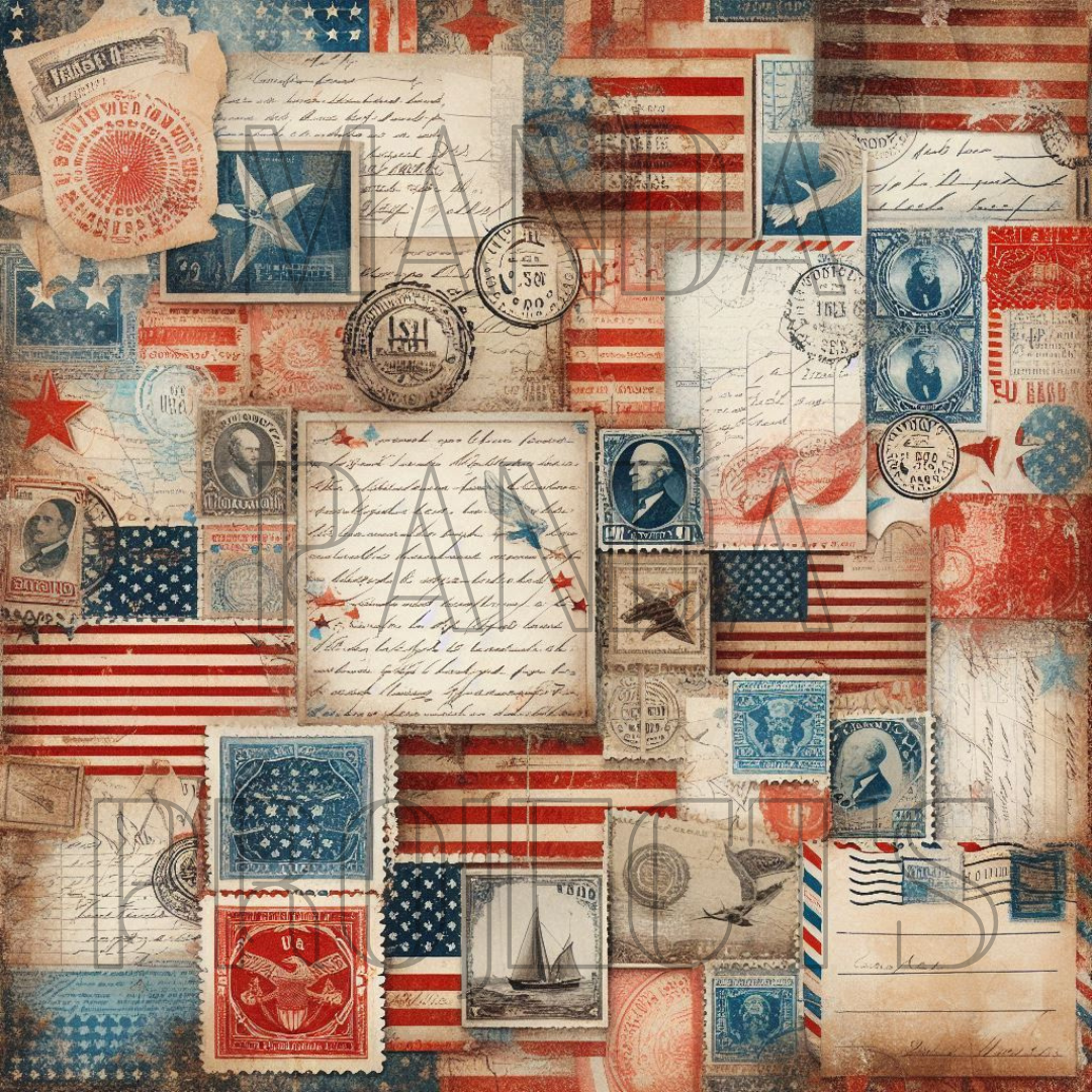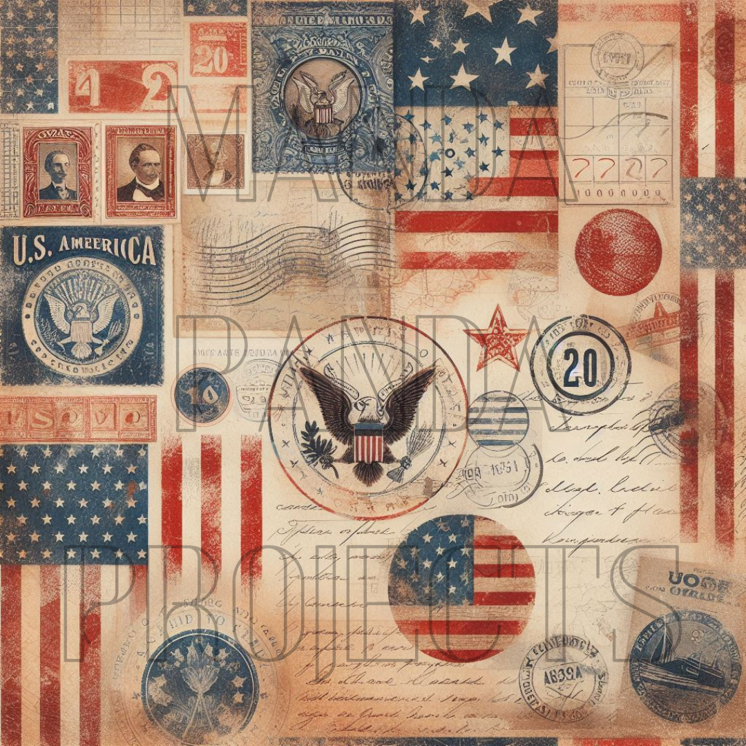 This collection is filled with aged textures, vintage postage stamps, patriotic symbols, postmarks, and classic American imagery. With flags, eagles, old letters, seals, and weathered reds, whites, and blues, this bundle feels like a walk through a turn-of-the-century post office—just waiting to be turned into art.