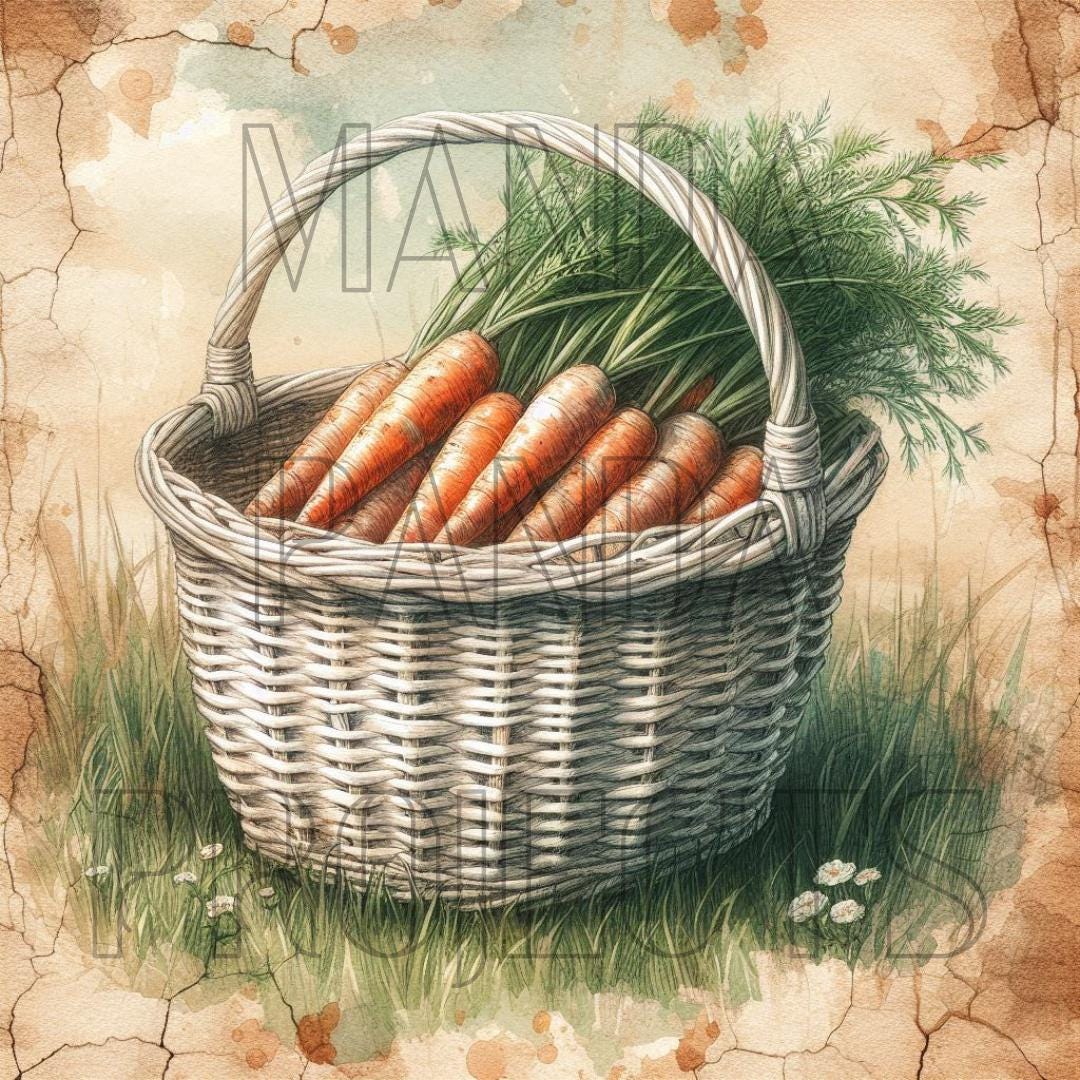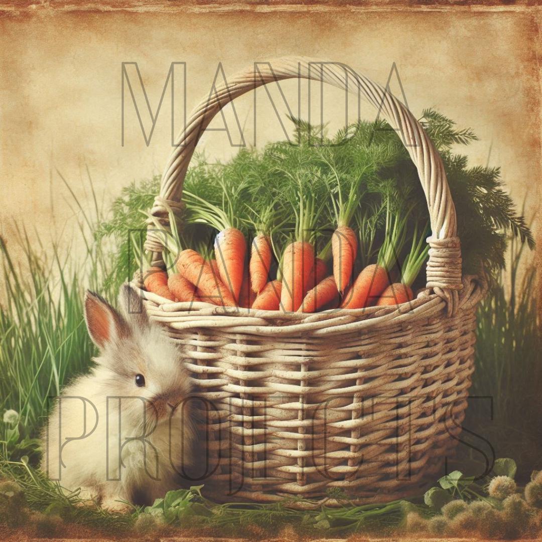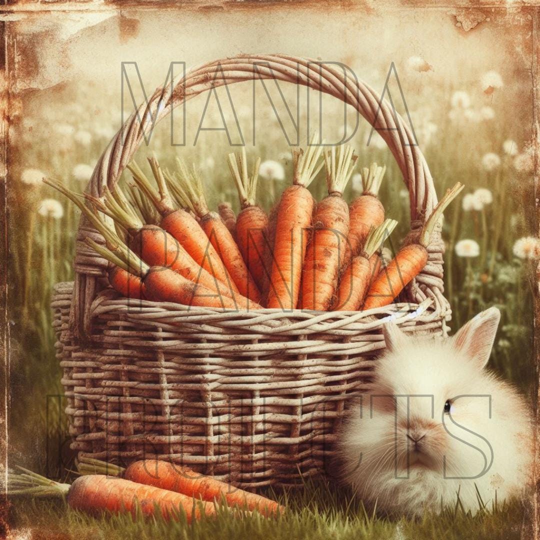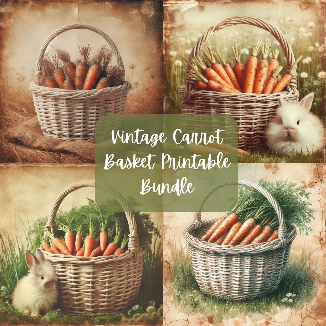Bring sweet vintage charm to your spring and Easter crafts with this “Vintage Carrot Basket” printable bundle! Featuring garden picked carrots, wicker baskets, distressed background, and a white fluffy bunny, these high-resolution designs are perfect for junk journals, greeting cards, tags, and seasonal decor.
