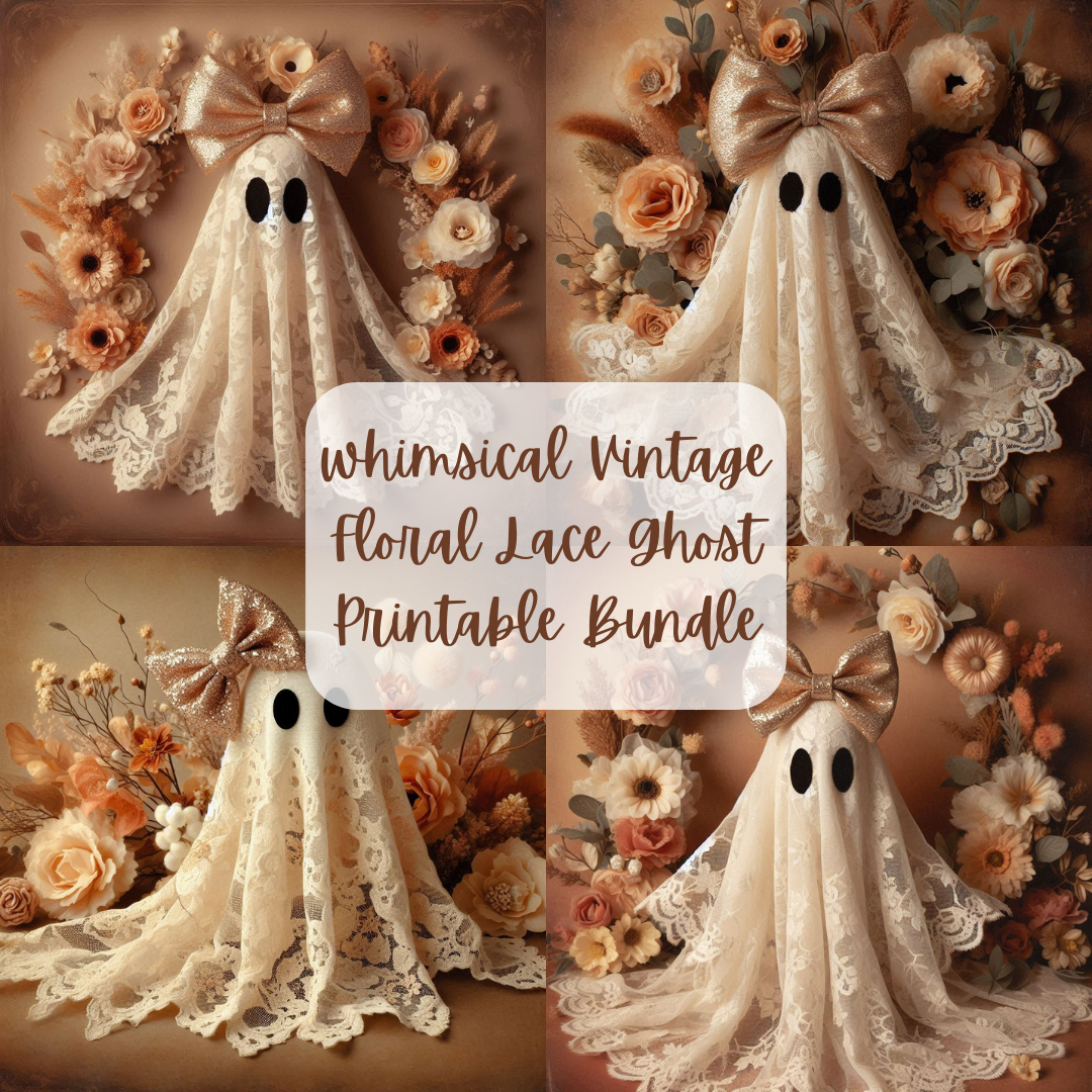 Bring a touch of spooky and sweet into your decor with this Whimsical Vintage Floral Lace Ghost Printable Bundle! Featuring beautifully detailed ghosts draped in vintage lace, accented with oversized bows and surrounded by dreamy floral arrangements, this printable set perfectly blends Halloween charm with timeless elegance.